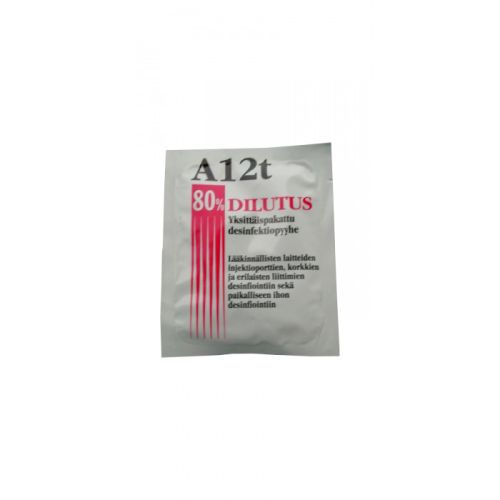 A12t Dilutus 80 % yksittäispakattu desinfektiopyyhe sisältää lievästi denaturoitua etanoliliuosta.