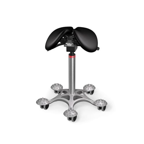 Kaksiosaisella satulatuolilla istut puoliseisovassa, aktiivisessa ja tasapainoisessa asennossa. Istuimen kulma saa lantion kääntymään neutraaliin pystyasentoonsa, jolloin selkäranka ja ylävartalo pysyvät ryhdikkäinä ilman lihastyötä. Voit istua hyväryhtisesti koko päivän, koska genitaalialueelle ei kohdistu liiallista lämpöä tai haitallista painetta, joten sinun ei tarvitse kääntää lantiota taaksepäin. Myös nestekierto toimii hyvin.